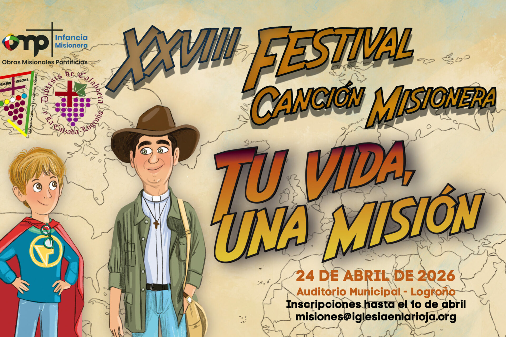 ¡Anímate a participar!XXVIII Festival de la Canción MisioneraEl viernes 24 de abril 2026, a las 18:00h en el Auditorio Municipal de Logroño.Con canciones originales o ya creadas con tema y espíritu misionero, y en el marco de la Jornada de la Infancia Misionera con el lema de este año: Tu vida, una misión.Fecha limite de inscripciones 10 de abril 2026.En la Delegación de Misiones Avda Navarra 3 - Logroño, telf. 941 245 899 (de lunes a viernes de 10:30h a 13:30H) o en misiones@iglesiaenlarioja.orgFicha de inscripción:www.dropbox.com/scl/fi/i547odadpmumq0a7a4s9z/02-Ficha-de-inscripc-n-XXVIII-Festival-de-la-Canci-n...Ficha representante del grupo:www.dropbox.com/scl/fi/d3308qfgb32o70h0r292u/04-Ficha-de-representante-para-darto-e-Im-genes-Fest...Ficha de participación y autorización de imágenes:www.dropbox.com/scl/fi/wtt35u0kdg2kzh8zgglfw/03-Ficha-autorizaci-n-de-participaci-n-e-Im-genes-Fe...#InfanciaMisionera, #ObrasMisionalesPontificias, #IglesiaenLaRioja ... Ver másVer menos